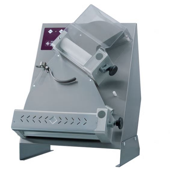 Laminoir à pâte (Pizza Group) | Diamètre réglable de 140 à 310 mm, pour pâtons de 80 à 210 g | 2 rouleaux en téflon, inox AISI 304, alimenté en monophasé 230 V. |